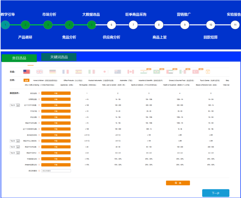 2-4实验原理(简要阐述实验原理,并说明核心要素的仿真度) 基于大数据分析的跨境电商运营虚拟仿真实验,是以跨境电商大数据选品为基础,基于真实数据建立分析模型,使用Python运用Scrapy框架进行数据采集,融入可视化大数据分析环节,设计虚拟仿真实验任务,真实模拟跨境电商在大数据环境下的运营流程。通过虚拟仿真实验教学系统模拟国外主流跨境电商平台来构建真实的跨境电商运营环境,全仿真模拟跨境电商交易平台,以卖家选品和店铺运营为核心点,增强学生选品与运营能力,帮助学生熟悉选品流程及交易平台规则,熟悉店铺运营要点,同时提高教学效率和教学质量,帮助老师实时掌控学生学习情况,增加实战教学的可控性和趣味性。本项目最大程度地还原了跨境电商运营中涉及到的业务流程及数据分析决策,核心要素是跨境电商数据分析决策的运作原理与操作步骤。 知识点:共 5 个 (1)基于大数据的市场分析与选品分析,提供至少5个品类的市场真实数据,通过数据建模,预测市场发展趋势与竞争状况,帮助学习者进行选品决策。 (2)基于大数据的供应商分析与产品采购,结合真实用户数据,进行供应商分析与选择,完成产品的采购。 (3)产品发布与优化:产品发布流程操作,依据用户定位与竞争分析的可视化数据等,进行产品的优化决策。 (4)数据化精准营销:通过可视化数据分析,依据用户画像定位用户需求,制定个性化营销策略。 (5)回款结算:了解平台的回款规则,掌握基本的回款结算流程。 |