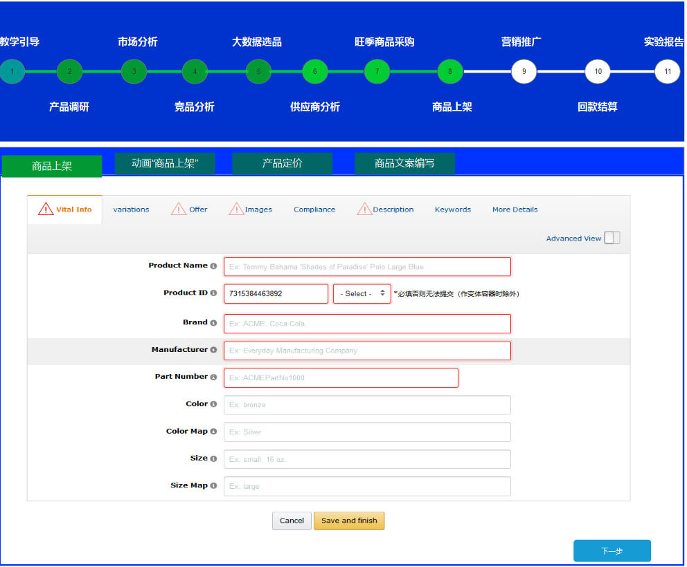 2-11面向学生要求 1. 专业与年级要求 本实验开设为电子商务、商务英语等跨境电商相关专业二年级及以上学生。 2. 基本知识和能力要求 1)掌握跨境电商选品、数据分析、运管管理相关的基础知识; 2)具备基本的实验操作技能与实践能力,以及一定程度的自主创新和独立解决问题的能力; 3)具备一定的团队合作意识; 4)能够运用虚拟软件开展实验,并了解相关实验安全规范。 |