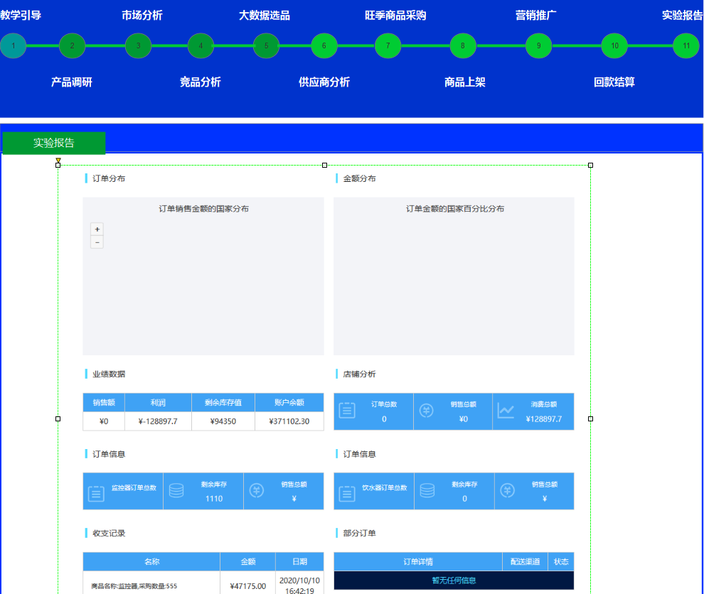 2-6实验材料(或预设参数等) 1. 依托前沿科技大数据分析等技术融入实践教学,利用动画、人机交互等技术,构建跨境电商平台虚拟场景。 2.数据资料:包括第三方跨境电商平台线上用户信息、商品信息、营销信息、订单、支付单等。